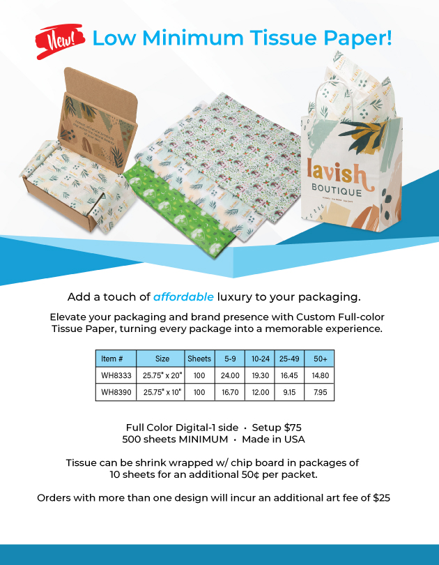 Elevate your brand with our Full Color, Low Minimum, Custom Tissue Paper. Designed to captivate customers and leave a lasting impression.